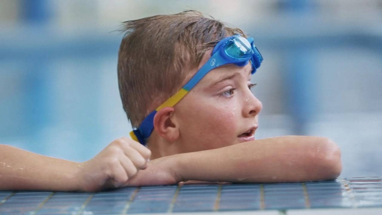 Kinderen zwemmen in een zwembad, een vrouw loopt een ziekenhuis in en mensen doen boodschappen op de groenteafdeling.